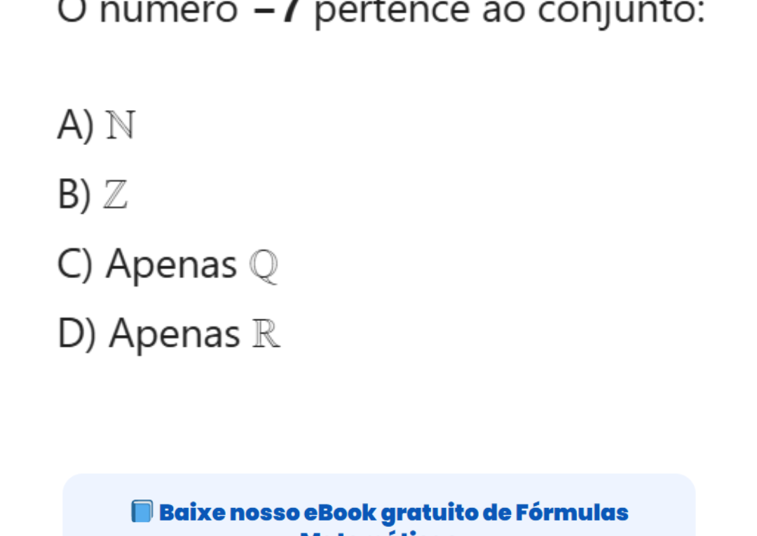 Continue lendoClassificação do Número −7 nos Conjuntos Numéricos Conjuntos Numéricos – Classificação do −7 O número −7 pertence ao conjunto: A)