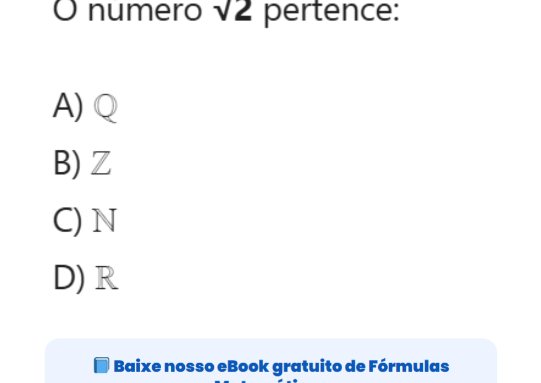 Continue lendoClassificação de √2 nos Conjuntos Numéricos Conjuntos Numéricos – Onde √2 Está? O número √2 pertence: A) ℚ B) ℤ