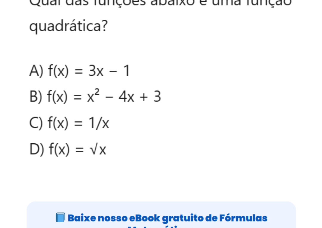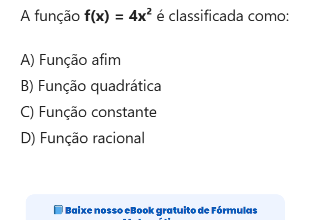 Continue lendoClassificação da Função 4x² Função Quadrática – Classificação A função f(x) = 4x² é classificada como: A) Função afim B)