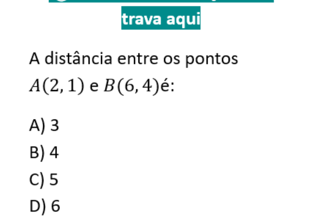 Continue lendoVer solução completa 1 – Identificando os pontos: A(2,1) e B(6,4) 2 – Aplicando a fórmula da distância: d =