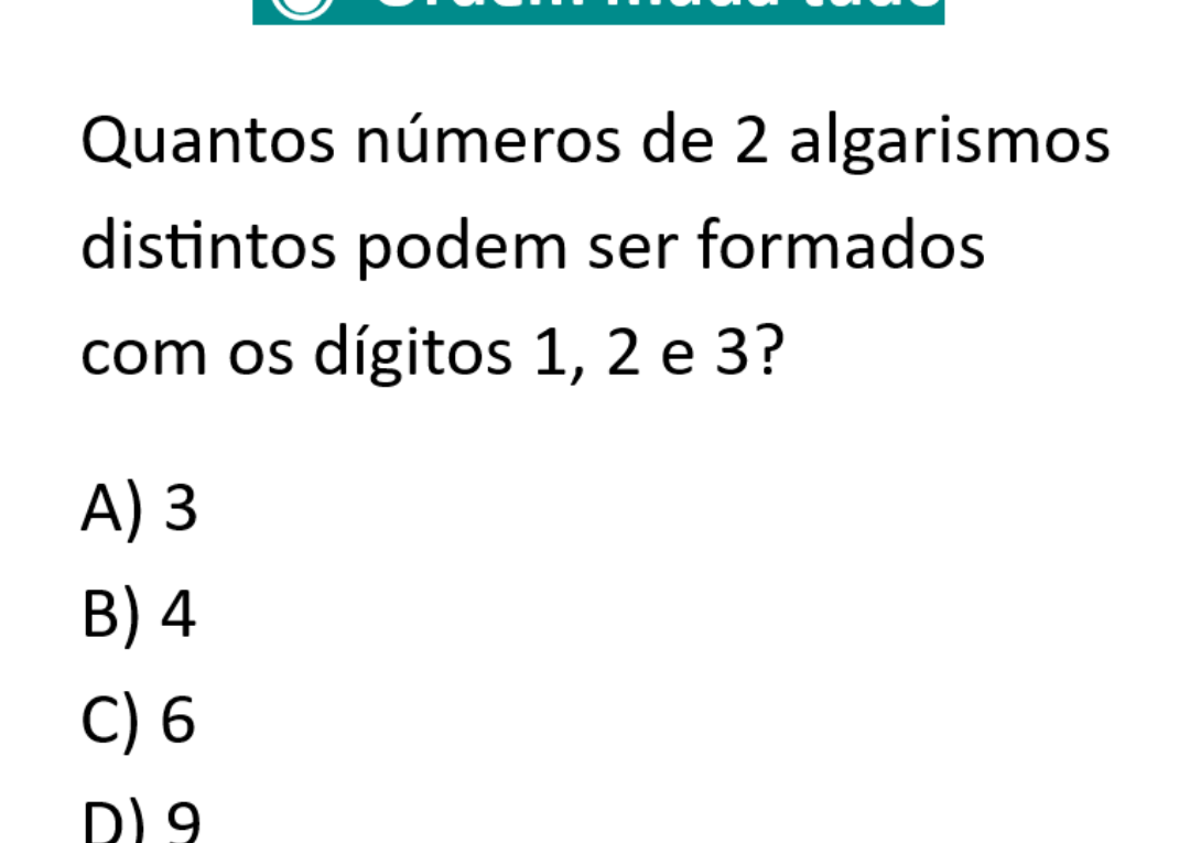 Continue lendoVer solução completa 1 – Entendendo o problema: Queremos formar números de 2 algarismos distintos usando {1, 2, 3} 2