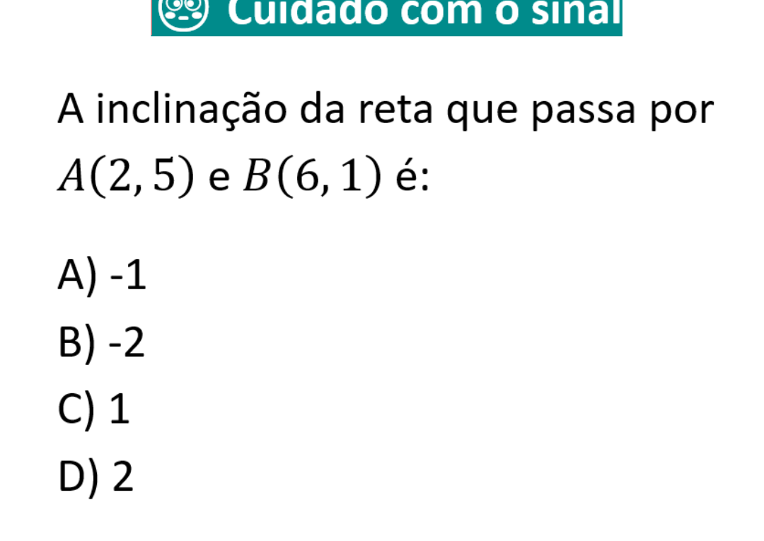 Continue lendoVer solução completa 1 – Identificando os pontos: A(2, 5) e B(6, 1) 2 – Fórmula do coeficiente angular: m