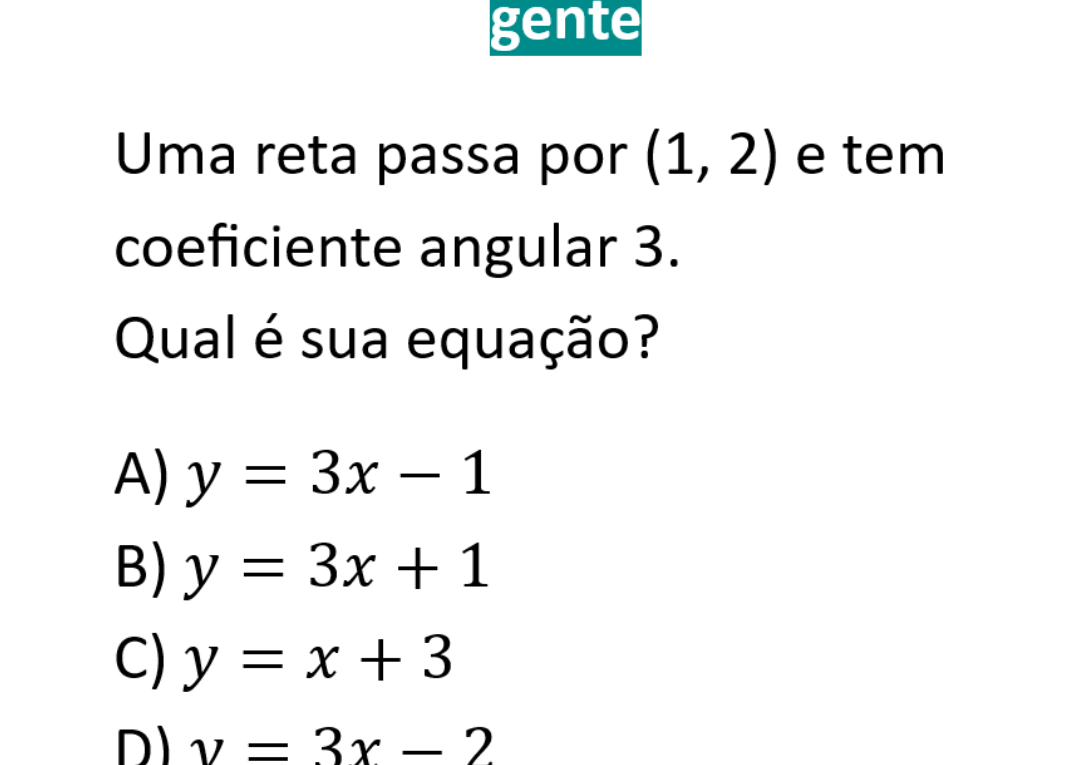 Continue lendoVer solução completa 1 – Dados do problema: Ponto (1,2) e coeficiente angular m = 3 2 – Forma da