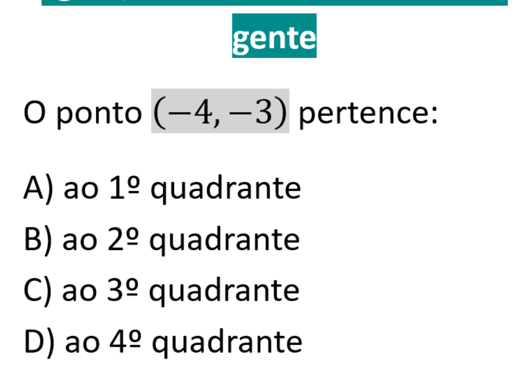 Continue lendoVer solução completa 1 – Identificando o ponto: (-4, -3) 2 – Analisando os sinais: x = negativo y =