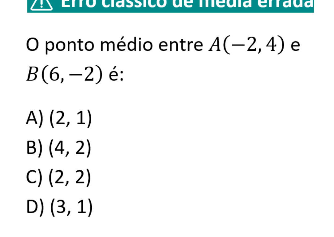 Continue lendoVer solução completa 1 – Identificando os pontos: A(-2, 4) e B(6, -2) 2 – Aplicando a fórmula do ponto