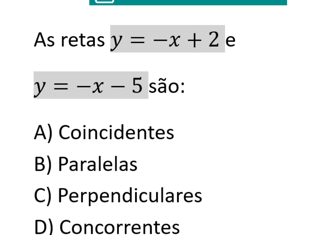 Continue lendoVer solução completa 1 – Identificando as equações: y = -x + 2 y = -x – 5 2 –