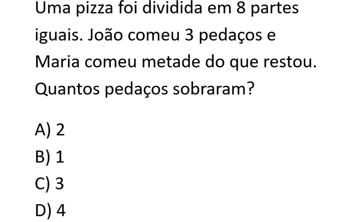 Continue lendo🚀 Receber questões resolvidas todos os dias 🔥 Clique para ver a solução 1. Total de pedaços: 8 2. João