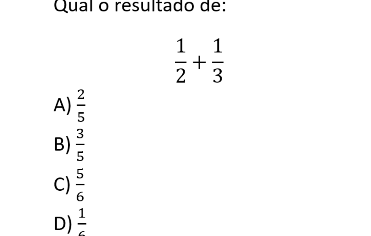 Continue lendo🚀 Receber questões resolvidas todos os dias 🔥 Clique para ver a solução 1. Frações dadas: 1/2 + 1/3 2.