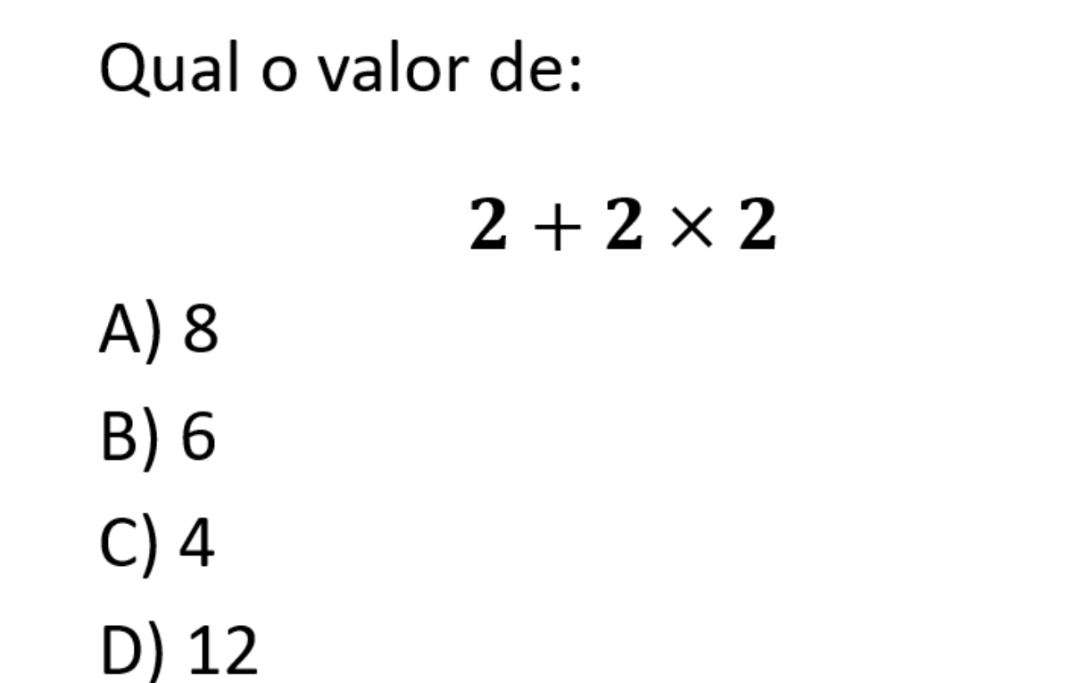Continue lendo🚀 Receber questões resolvidas todos os dias 🔥 Clique para ver a solução 1. Expressão: 2 + 2 × 2