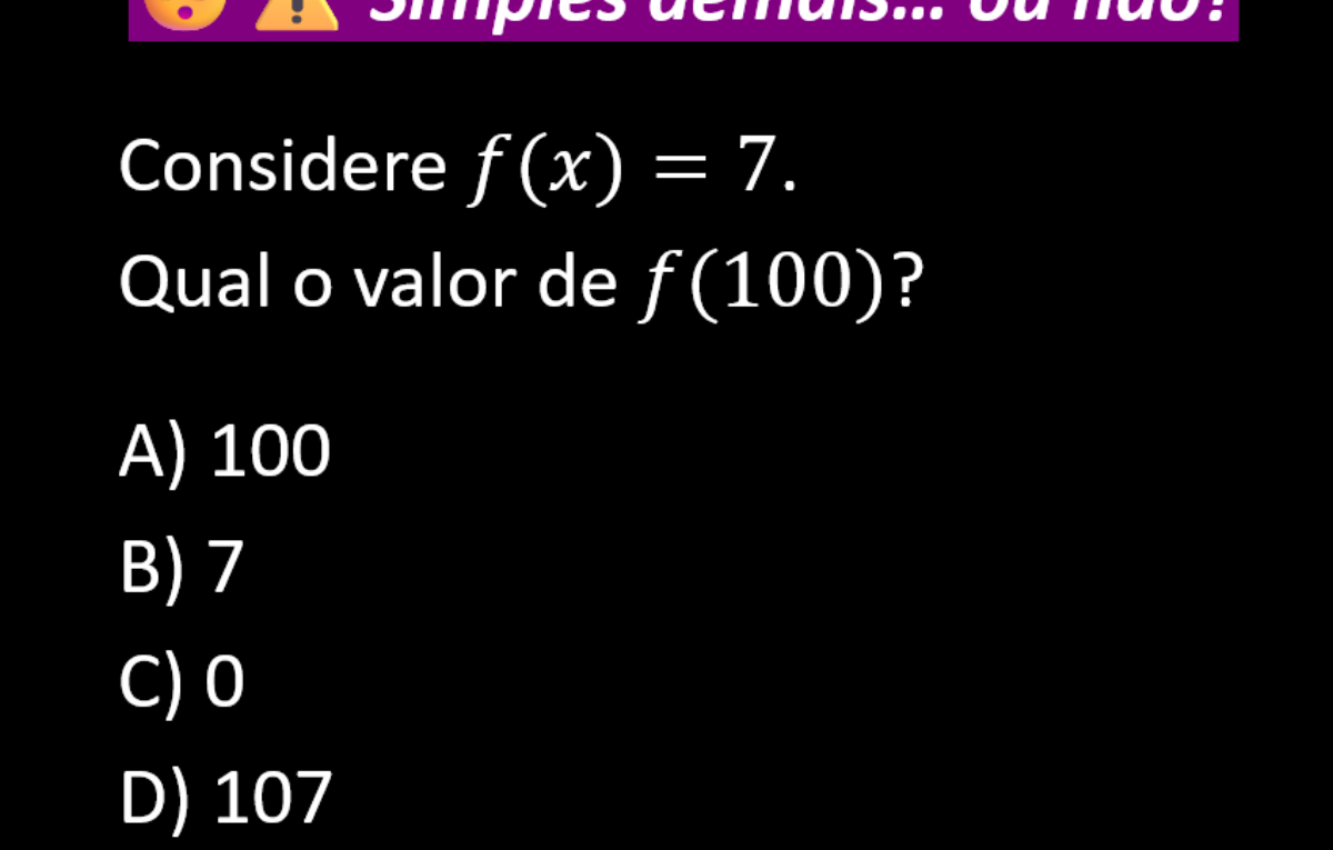 Continue lendoVer solução 1 – Entendendo a função: f(x) = 7 2 – Conceito chave: Essa é uma função constante, ou