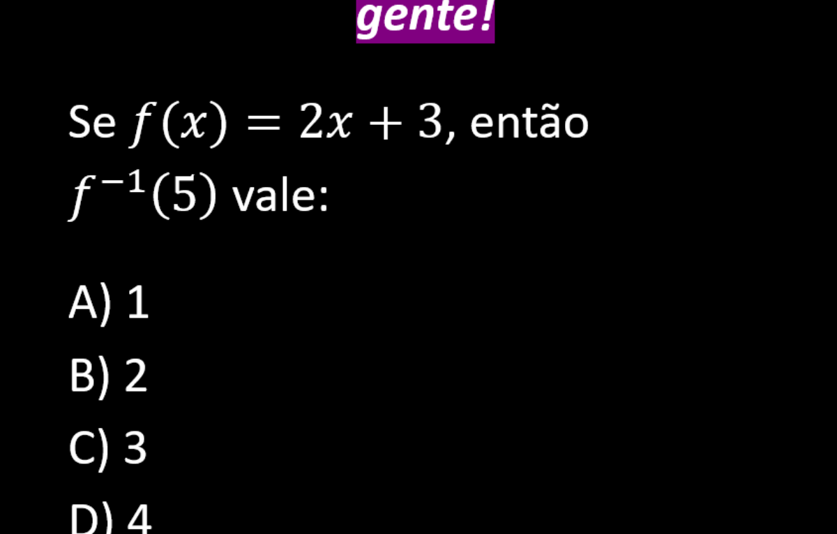 Continue lendoVer solução 1 – Entendendo o problema: Temos: f(x) = 2x + 3 Queremos encontrar f⁻¹(5) 2 – Encontrando a