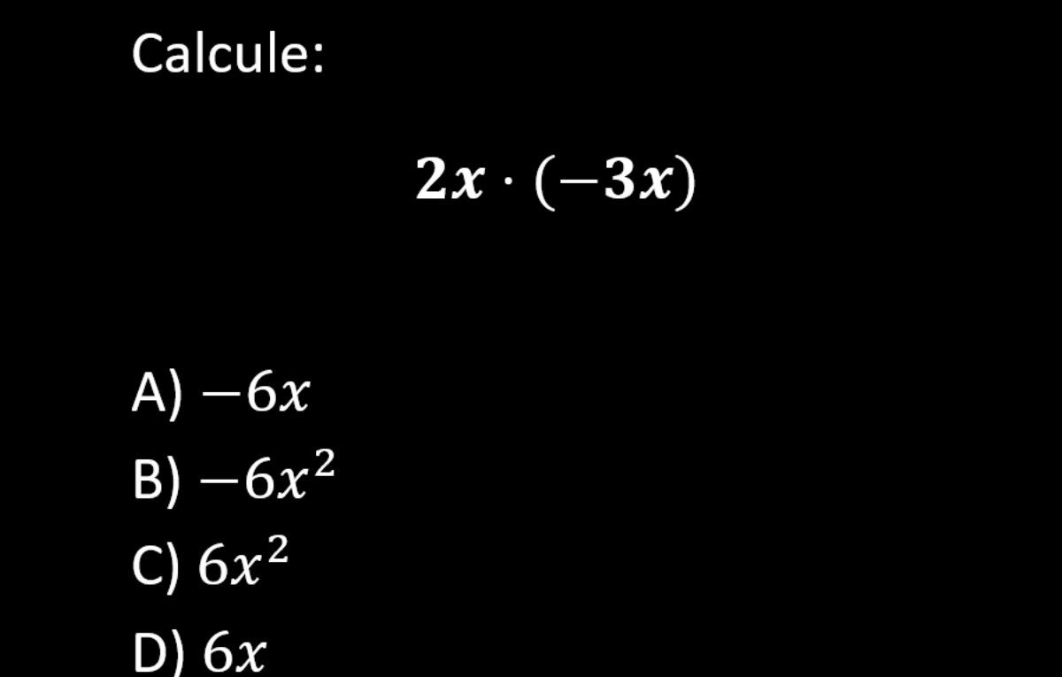 Continue lendoVer solução 1 – Multiplicando os números: 2 × (−3) = −6 2 – Multiplicando as letras: x × x