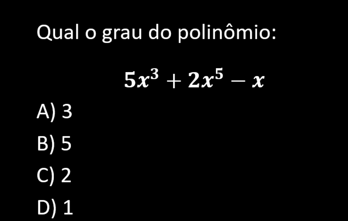 Ver solução 1 – Observando os termos: 5x³, 2x⁵ e −x 2 – Identificando os expoentes: x³ → grau 3