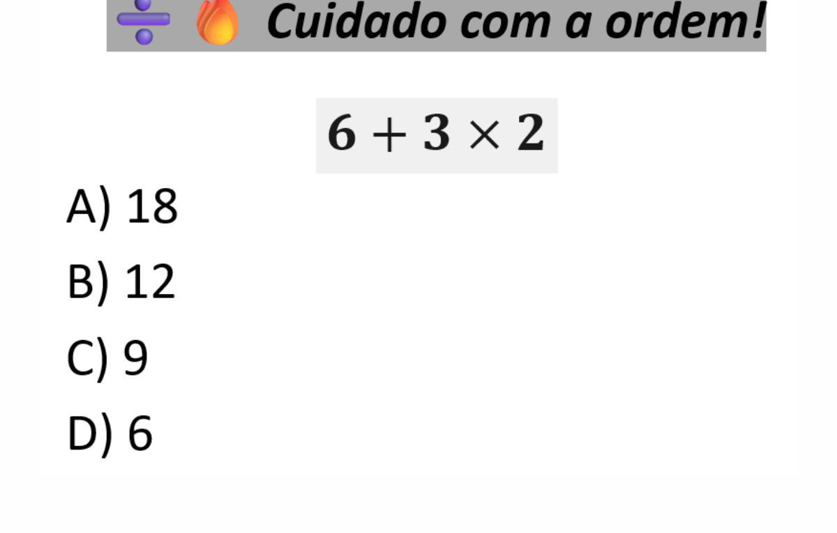 Continue lendoVer solução passo a passo 1. Expressão dada: 6 + 3 × 2 2. Aplicamos a ordem das operações: Primeiro
