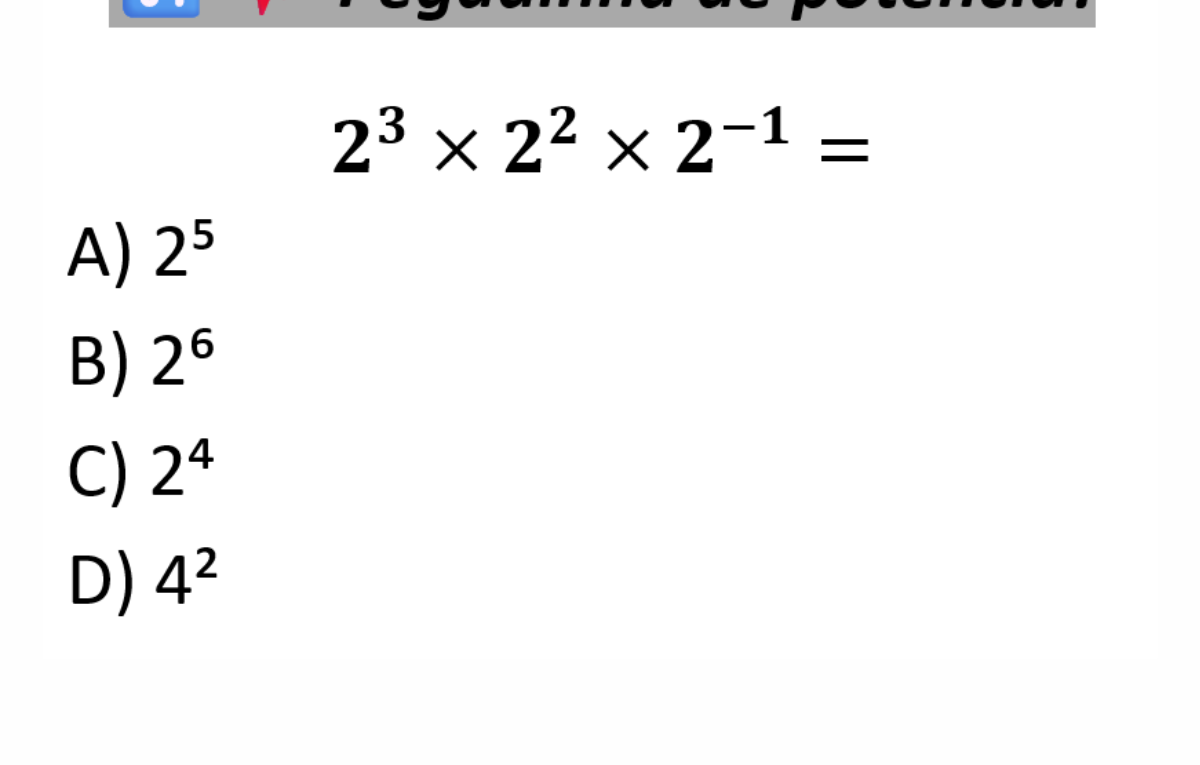 Continue lendoVer solução passo a passo 1. Expressão dada: 2³ × 2² × 2⁻¹ 2. Regra das potências de mesma base: