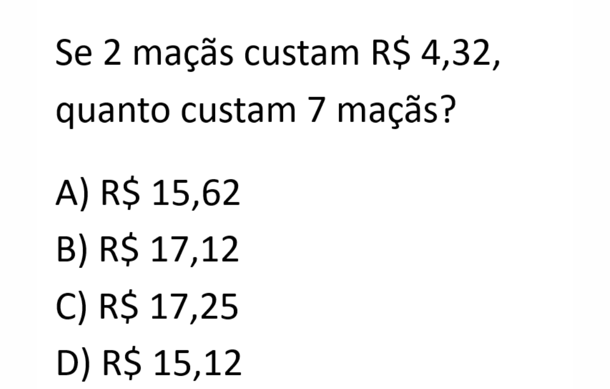 Continue lendoVer solução passo a passo 1. Preço de 2 maçãs: R$ 4,32 2. Preço de 1 maçã: 4,32 ÷ 2
