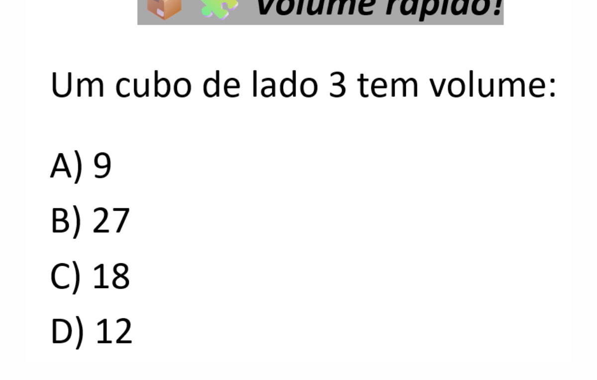 Continue lendoVer solução passo a passo 1. Fórmula do volume do cubo: V = lado³ 2. Substituindo o valor: V =