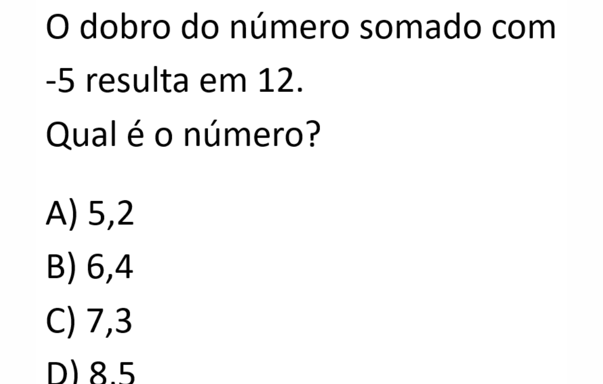 Continue lendoVer solução passo a passo 1. Representamos o número por x: 2. Montamos a equação: 2x – 5 = 12