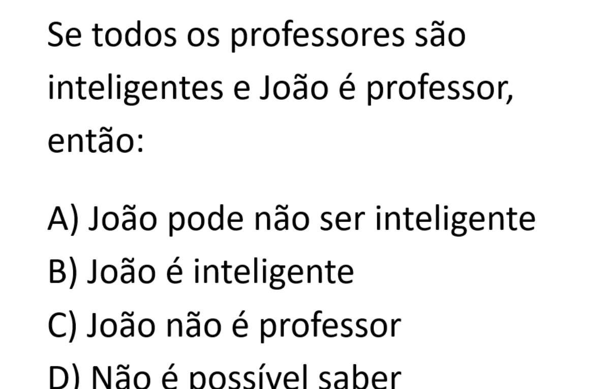 Ver solução passo a passo 1. Informação dada: Todos os professores são inteligentes 2. João é professor 3. Conclusão lógica: