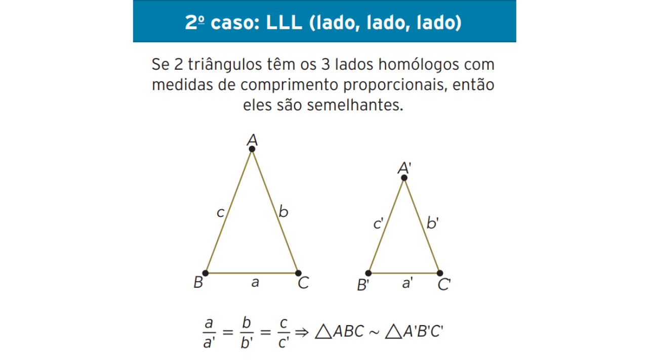 O terceiro caso de semelhança afirma que: se dois triângulos possuem dois lados proporcionais e o ângulo compreendido entre eles é congruente, então esses triângulos são semelhantes.