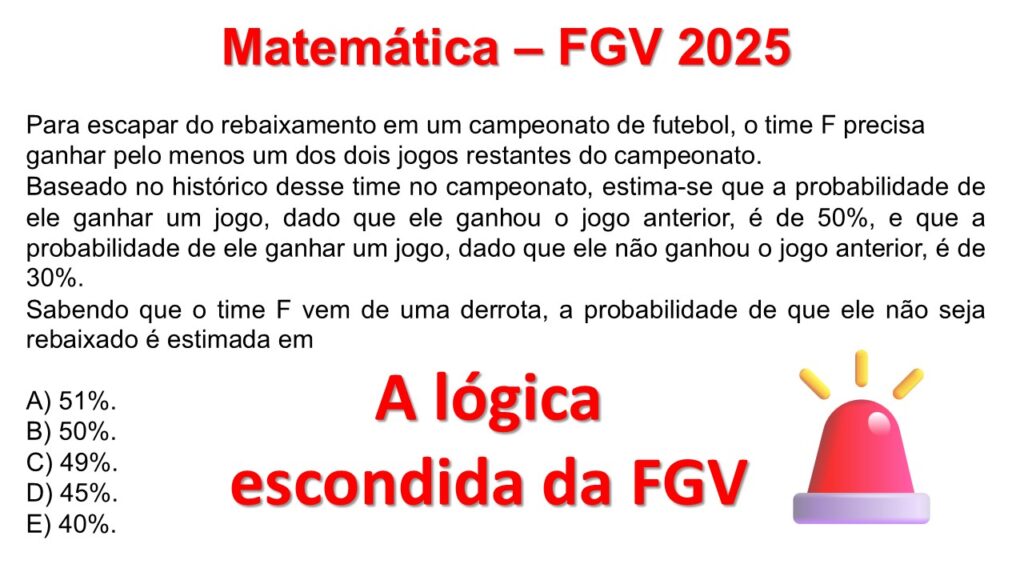 FGV 2025 Matemática | Probabilidade Condicional no Futebol Matemática – FGV 2025 Conteúdo: Probabilidade Condicional Para escapar do rebaixamento em um