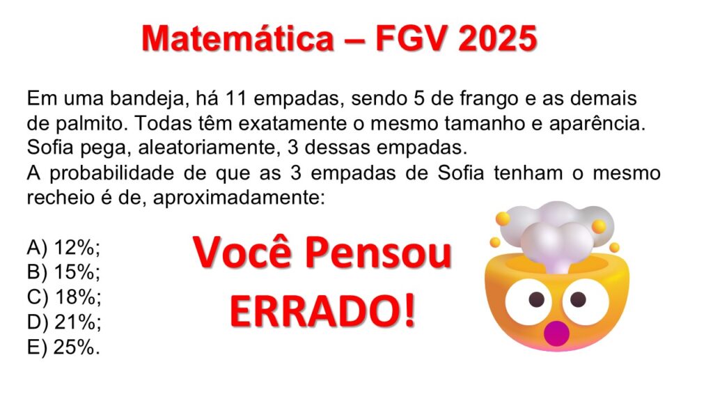FGV 2025 Matemática | Probabilidade com Empadas Matemática – FGV 2025 Conteúdo: Probabilidade sem Reposição Em uma bandeja, há 11 empadas,