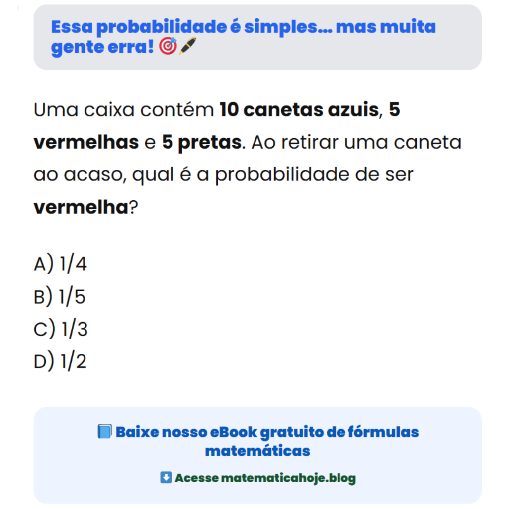 Essa probabilidade é simples… mas muita gente erra! 🎯🖊️ Em problemas de probabilidade, usamos a razão entre casos favoráveis e casos