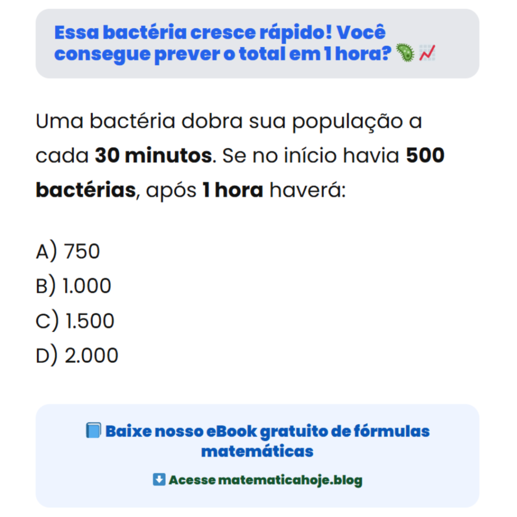 Essa bactéria cresce rápido! Você consegue prever o total em 1 hora? 🦠📈 Situações de crescimento rápido costumam envolver progressões geométricas.