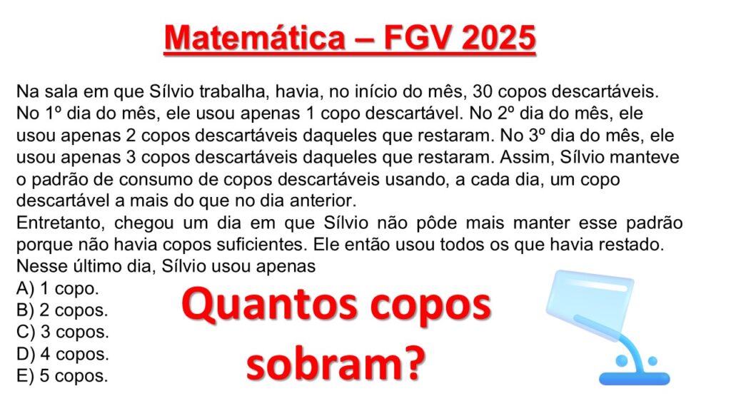 FGV 2025 Matemática | Consumo Crescente de Copos Matemática – FGV 2025 Conteúdo: Soma dos Naturais (1 + 2 + 3