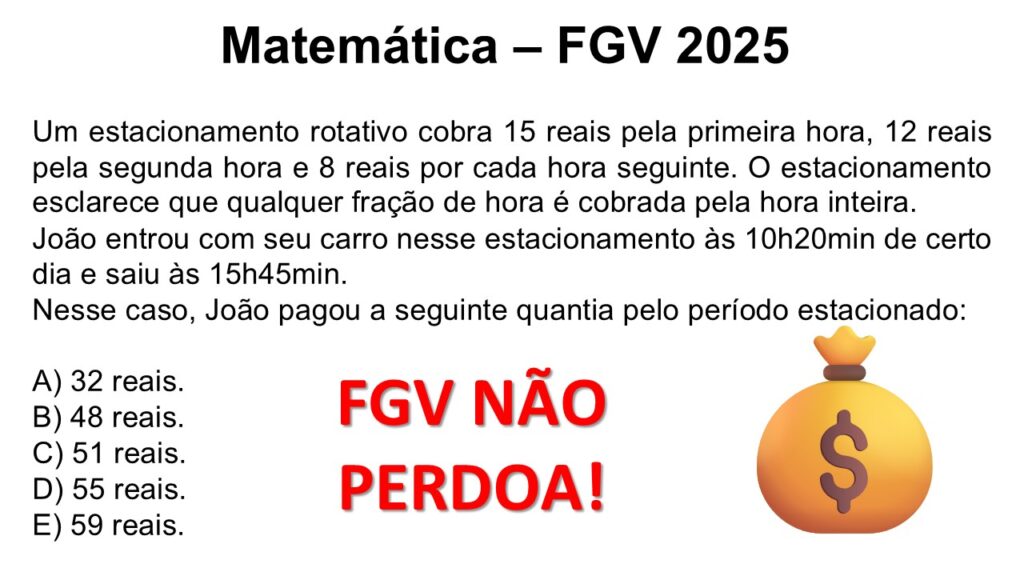 FGV 2025 Matemática: Estacionamento Rotativo e Cobrança por Hora Inteira