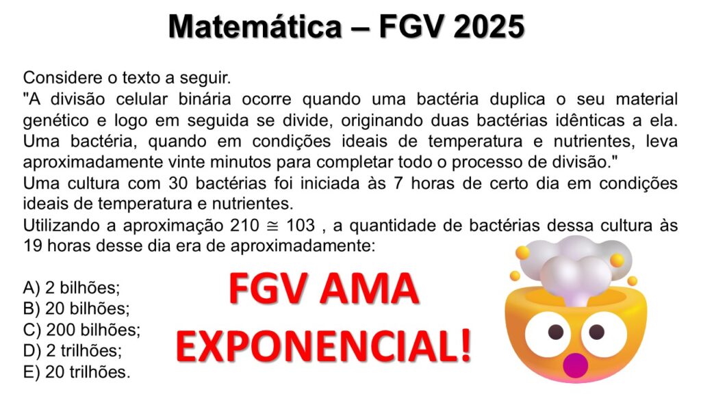 FGV 2025 Matemática | Crescimento Bacteriano Matemática – FGV 2025 Conteúdo: Potências, Exponenciais e Estimativas Considere o texto: “A divisão celular