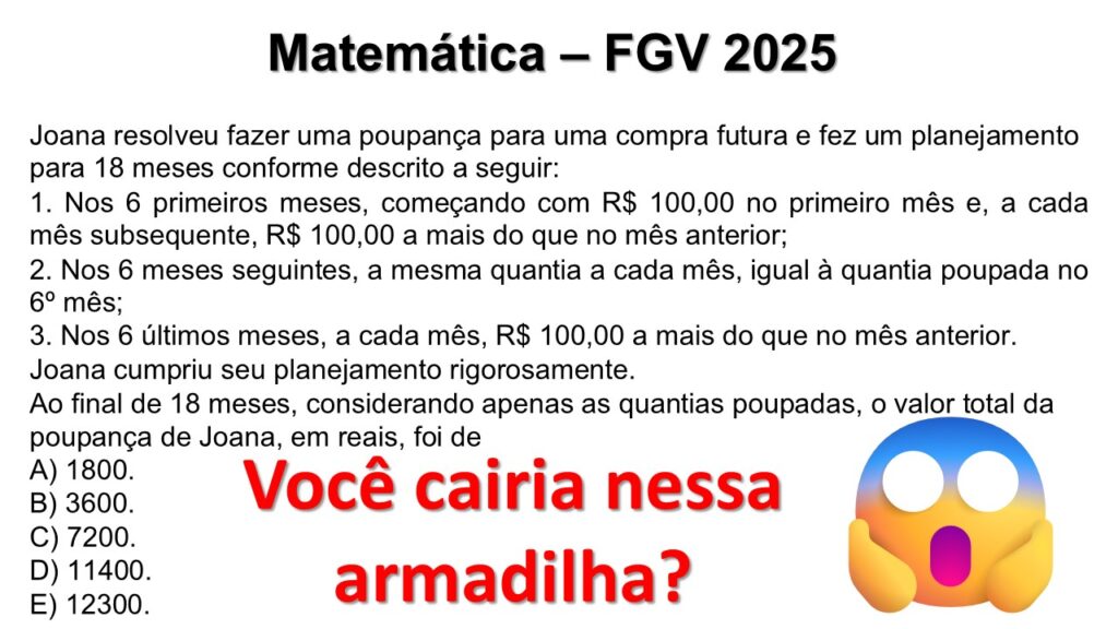 FGV 2025 Matemática | Poupança em 18 Meses (PA) Matemática – FGV 2025 Conteúdo: Progressão Aritmética e Soma de Termos Joana