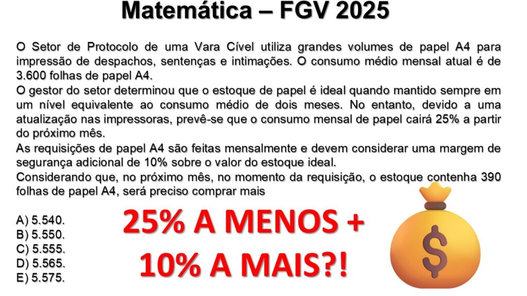 FGV 2025 Matemática: Consumo, Estoque Ideal e Margem de Segurança (Papel A4)