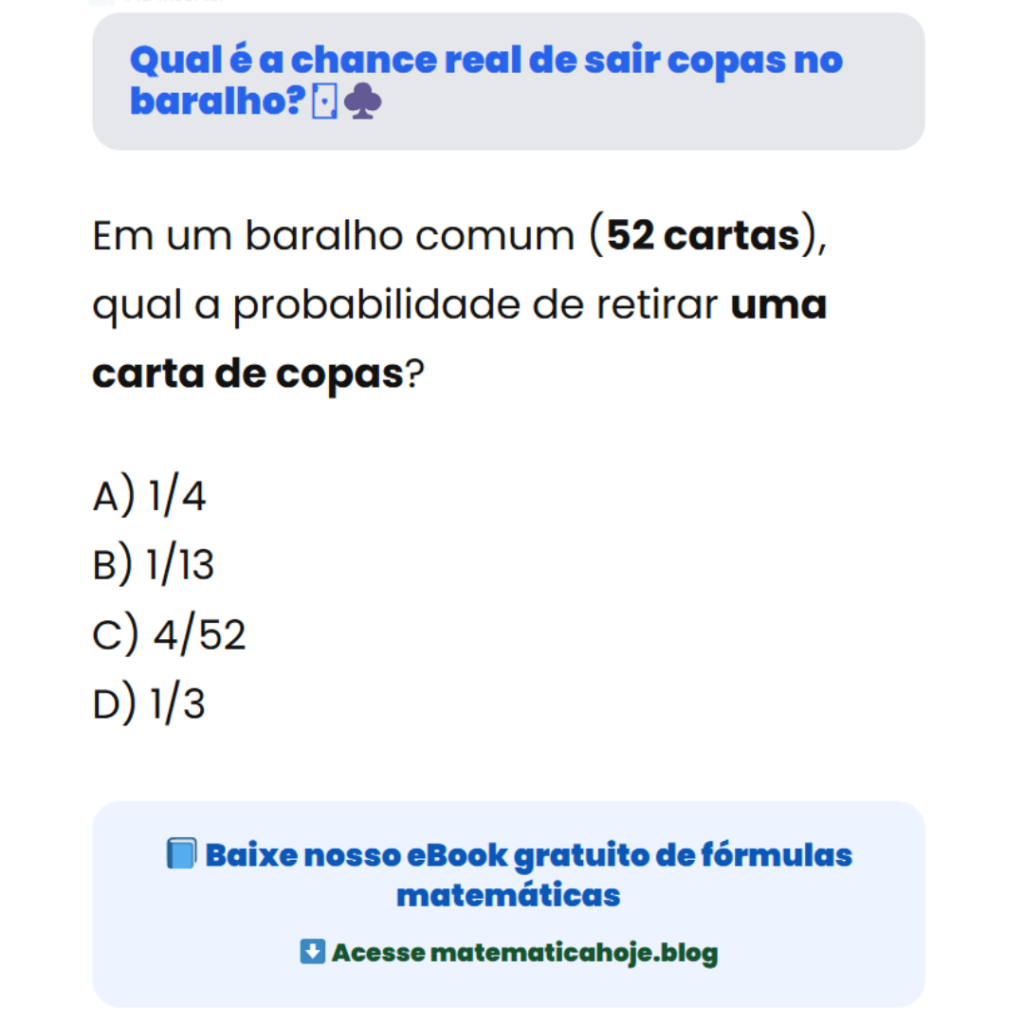 Qual é a chance real de sair copas no baralho? 🂱♣️ Em problemas de probabilidade, dividimos os casos favoráveis pelo total