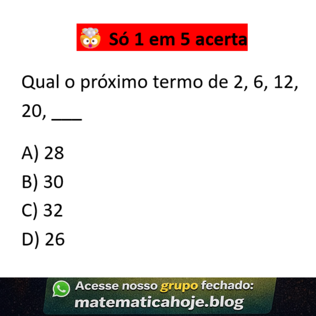 Clique aqui para ver a solução Sequência: 2, 6, 12, 20 👉 Observe o padrão: