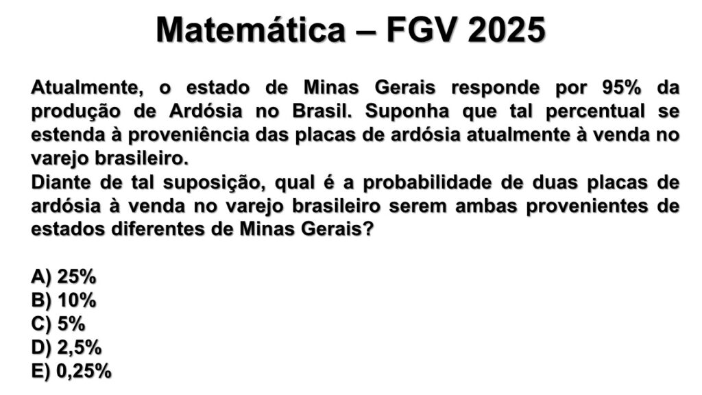 FGV 2025 Matemática: Probabilidade com Percentuais (Ardósia de Minas Gerais)