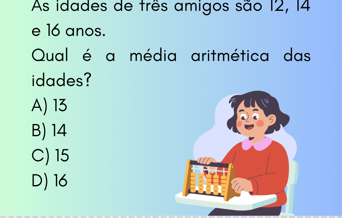 Continue lendo📊 Estatística — Média Aritmética Simples As idades de três amigos são 12, 14 e 16 anos. Qual é a