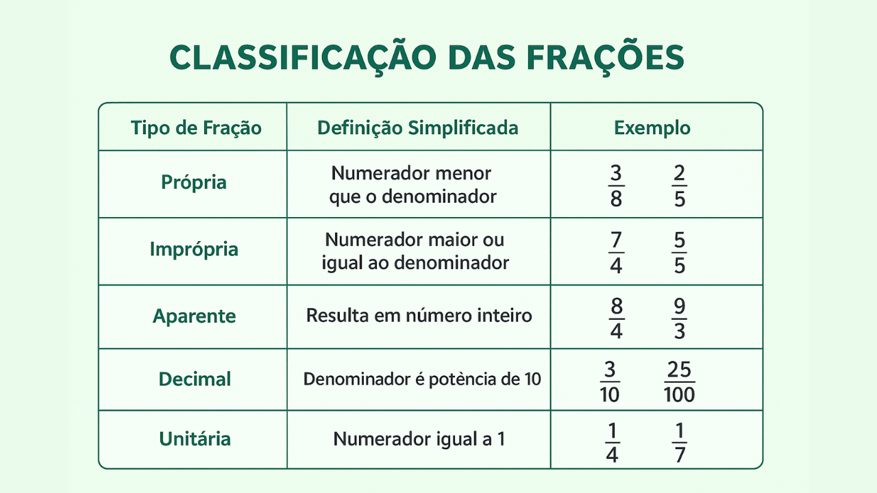 Continue lendoClassificação das Frações — Guia Completo com Exemplos Resolvidos Classificação das Frações Aprenda a diferenciar frações próprias, impróprias, aparentes, decimais