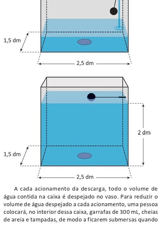 Nesta questão do ENEM 2025, analisamos uma caixa de descarga em forma de paralelepípedo reto retângulo. Primeiro calculamos o volume