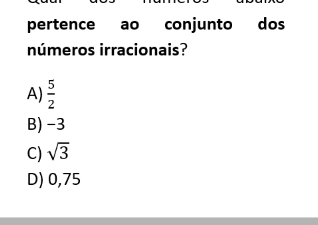Continue lendoClique aqui para ver a solução O problema pede identificar qual número pertence ao conjunto dos números irracionais. Números irracionais