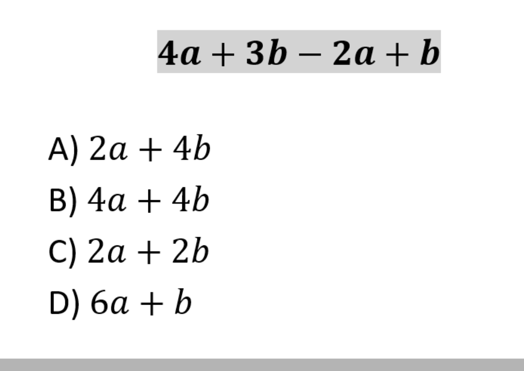 Continue lendoClique aqui para ver a solução Vamos simplificar a expressão: \[ 4a + 3b – 2a + b \] Para