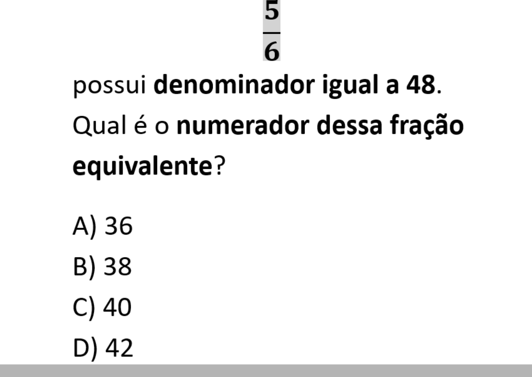 Continue lendoClique aqui para ver a solução Queremos encontrar uma fração equivalente a: \[ \frac{5}{6} \] com **denominador igual a 48**.