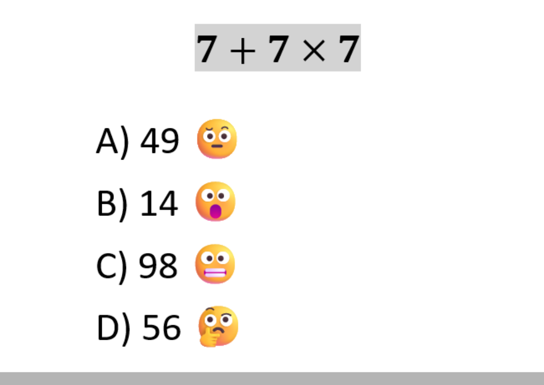 Continue lendoClique aqui para ver a solução Precisamos calcular: \[ 7 + 7 \times 7 \] Em expressões numéricas existe uma