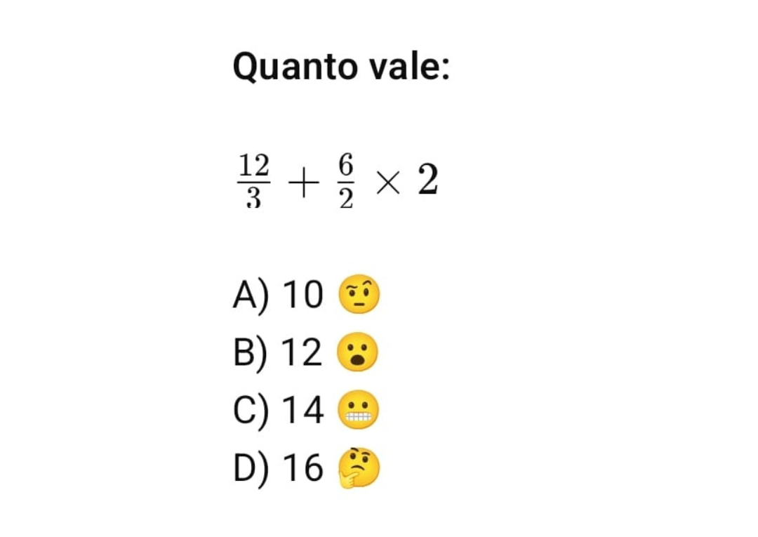 Continue lendoClique aqui para ver a solução passo a passo Vamos calcular a expressão: \[ \frac{12}{3} + \frac{6}{2} \times 2 \]
