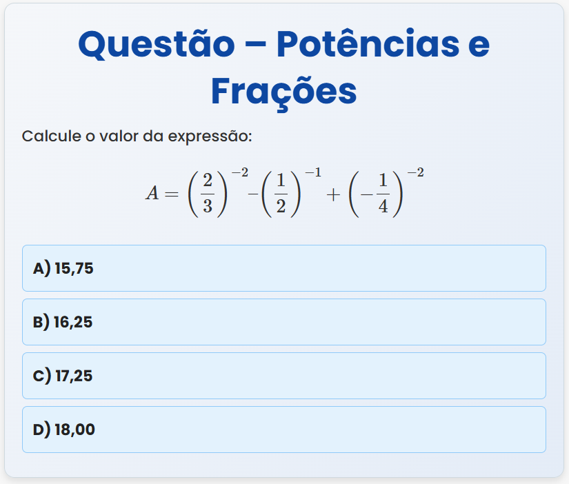 Continue lendoQuestão – Potências e Frações Calcule o valor da expressão: \[ A = \left( \frac{2}{3} \right)^{-2} – \left( \frac{1}{2} \right)^{-1}