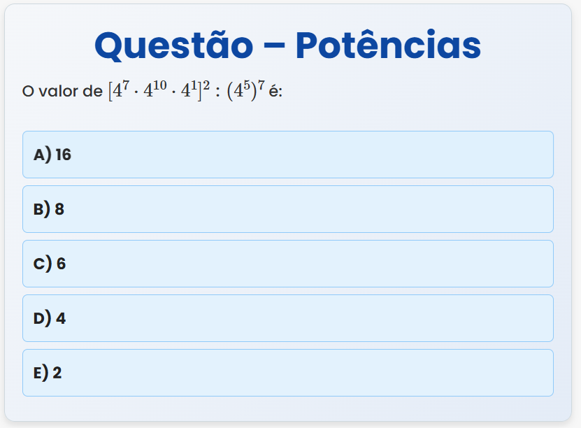 Continue lendoQuestão – Potências O valor de \( [4^{7} \cdot 4^{10} \cdot 4^{1}]^{2} : (4^{5})^{7} \) é: A) 16 B) 8