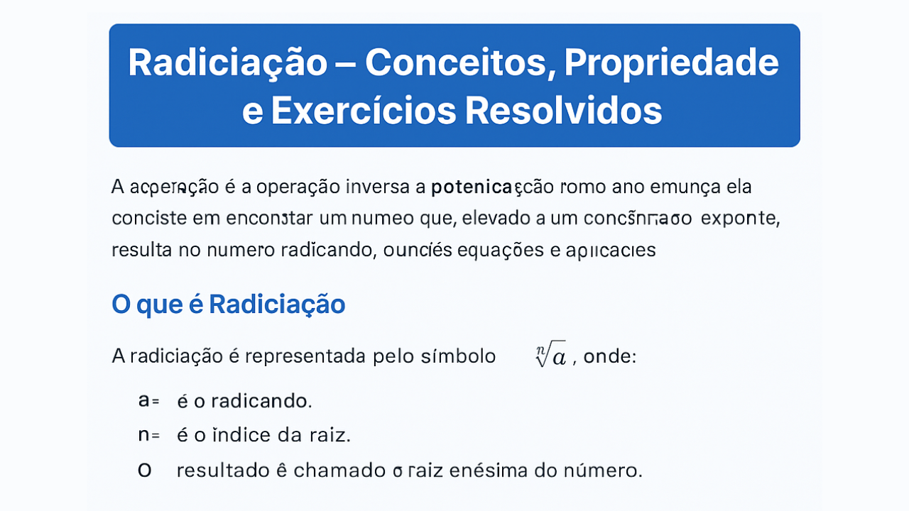 Continue lendoRadiciação — Conceitos, Propriedades e Exercícios Resolvidos Radiciação — Conceitos, Propriedades e Exercícios Resolvidos A radiciação é a operação inversa