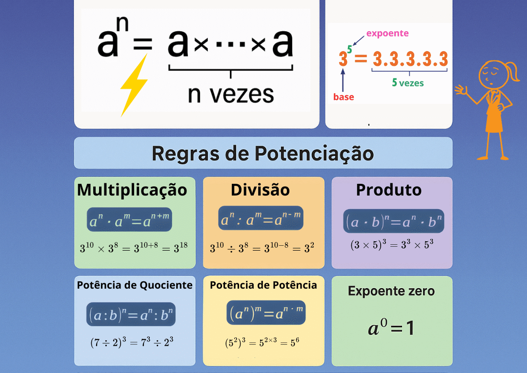 Continue lendoPropriedades da Potenciação: guia completo com exemplos e exercícios Propriedades da Potenciação Guia completo: entenda as regras, veja exemplos resolvidos