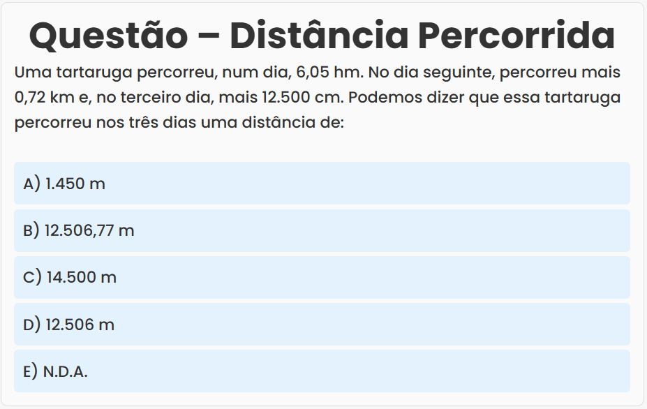 Continue lendoQuestão – Distância Percorrida Uma tartaruga percorreu, num dia, 6,05 hm. No dia seguinte, percorreu mais 0,72 km e, no