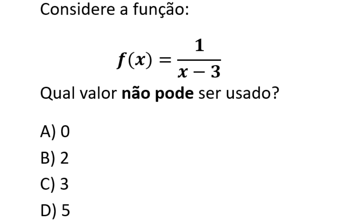 Continue lendoVer solução 1 – Entendendo o problema: Temos a função: f(x) = 1 / (x – 3) 2 – Regra